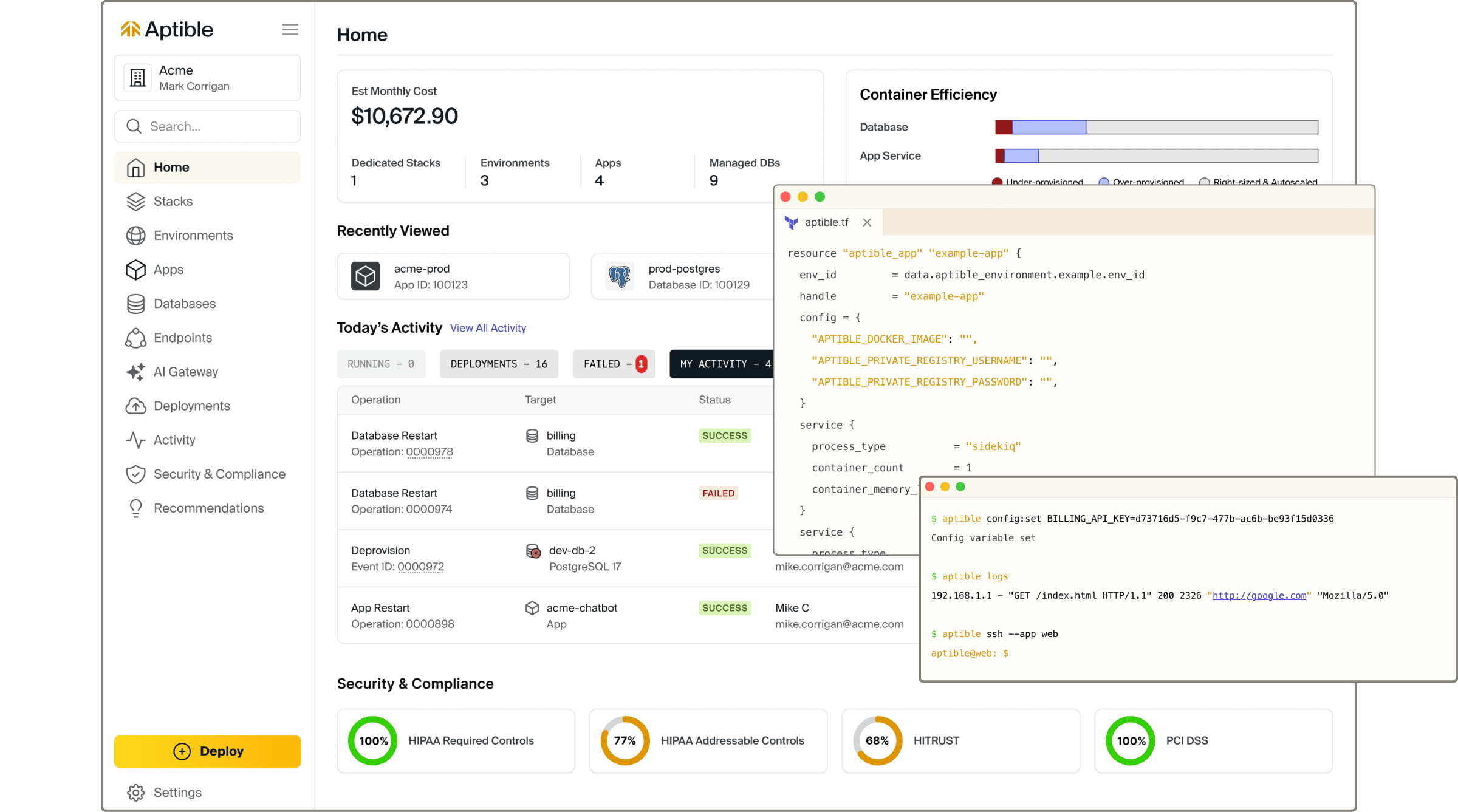 Aptible enforces encryption, audit logging, quotas, and availability for all LLM usage.