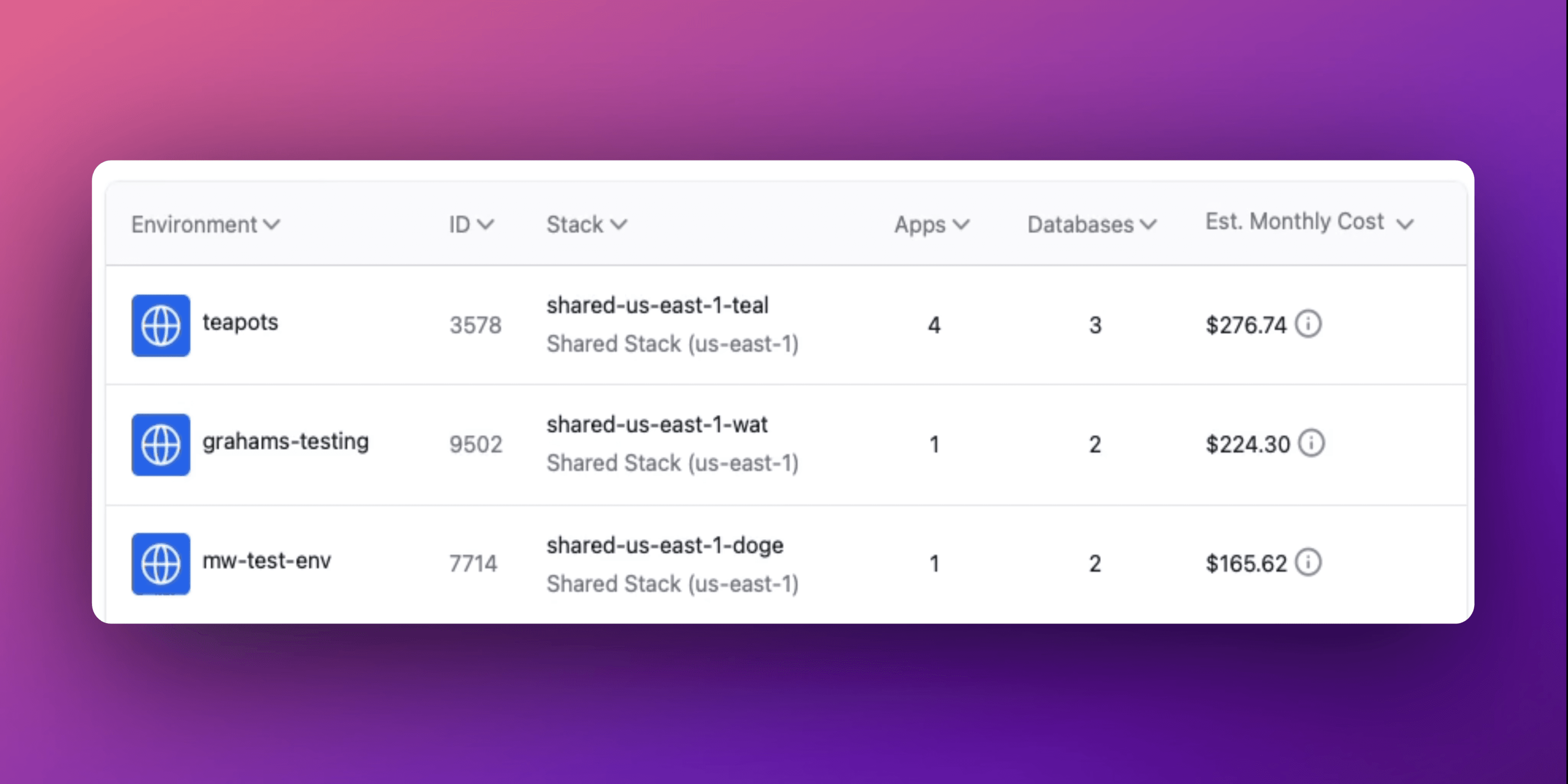 Real-time cost estimates for each Environment and Stack are now shown in the Aptible dashboard, helping you better forecast your monthly spending. Learn more.