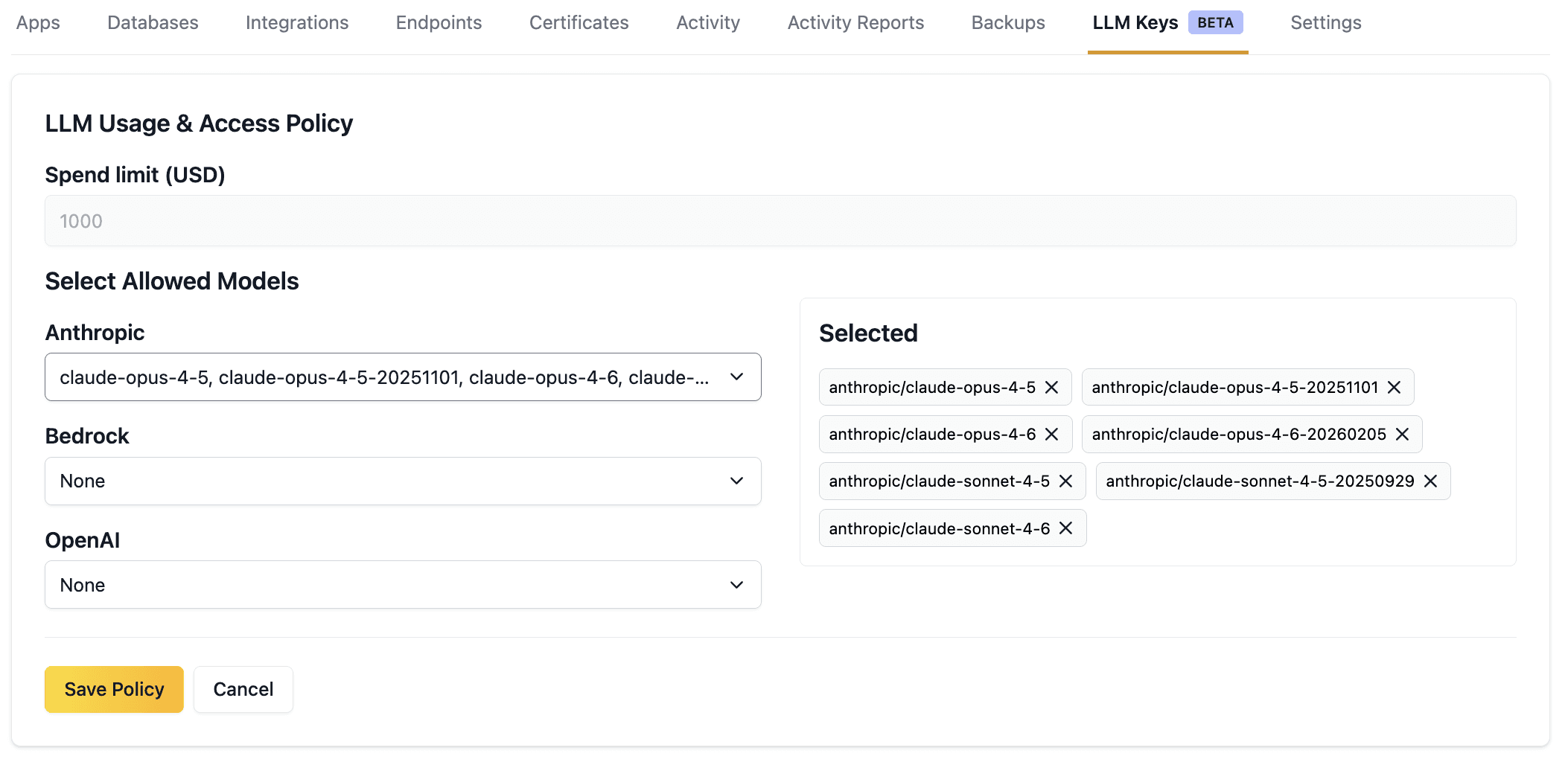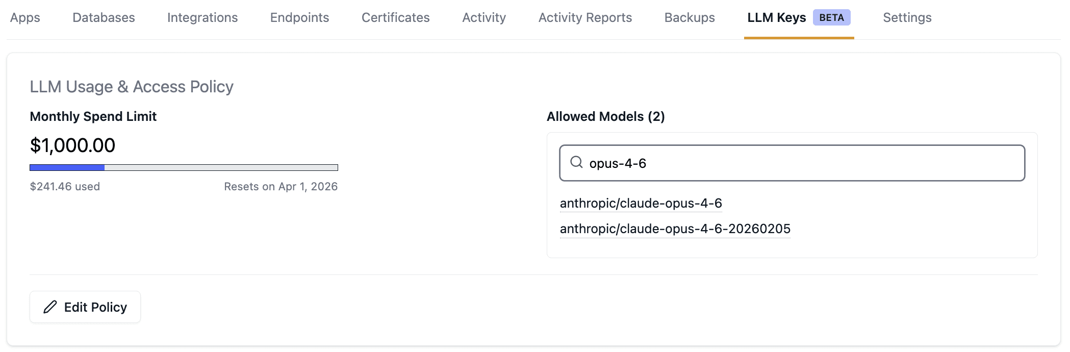Use model access policies to ensure that your applications and developers are using the right model for the job. Model access policies are set at the environment level and apply to all keys within that environment.