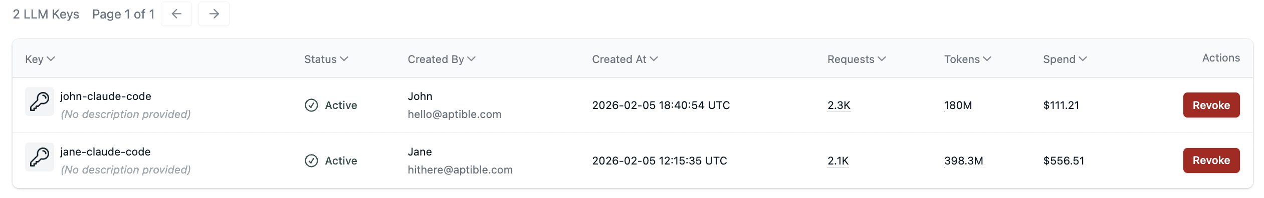 In the keys list and the key details page, you can see the spend during the current usage period for each key. Use this to understand which keys are most active, and which use cases might benefit from cost optimization.