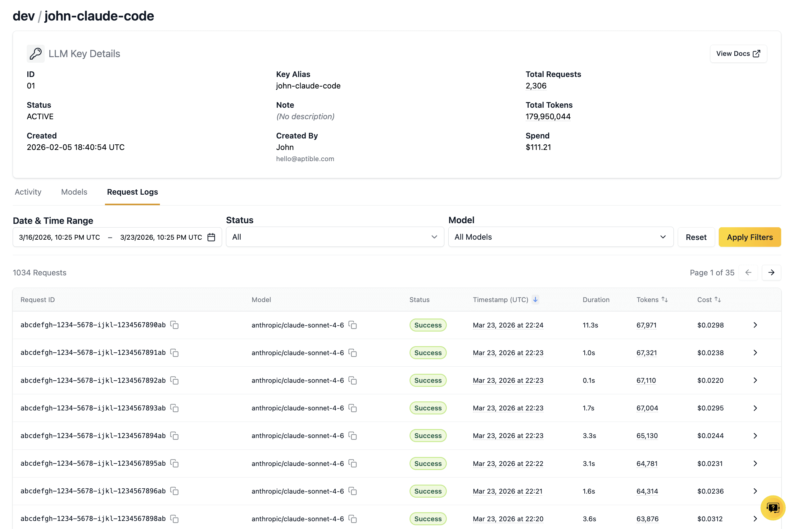 In the key details page, you can see all the requests made by the key in the last 7 days, including token usage and cost information.