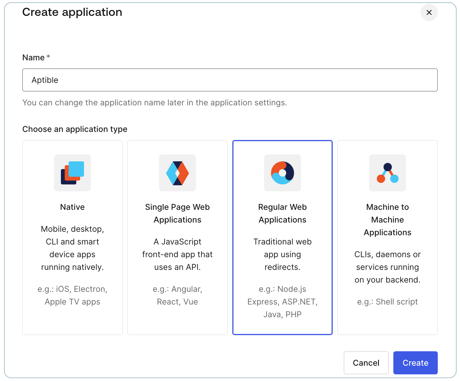 Log into your Auth0 dashboard. Navigate to Applications using the left navigation menu and click Create Application. Enter a name for your application (we suggest “Aptible”), select Regular Web Applications, and click Create.