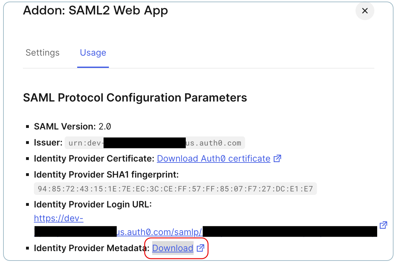 Select the Addons tab and enable the SAML2 WEB APP add-on by toggling it on. Navigate to the Usage tab and download the Identity Provider Metadata or copy the link to it. Close this window—It will toggle back to off, which is expected. We will activate it later.