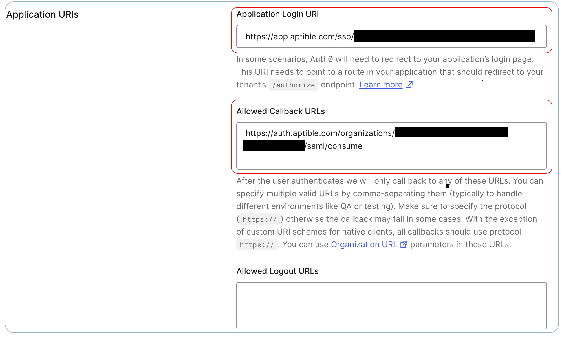(this is the Aptible value of Shortcut SSO login URL). - Allowed Callback URLs: