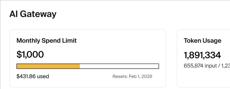 Set budget limits per scope and set alerts or hard stops when thresholds are reached. Usage can be monitored in real time so teams can manage AI spending intentionally.