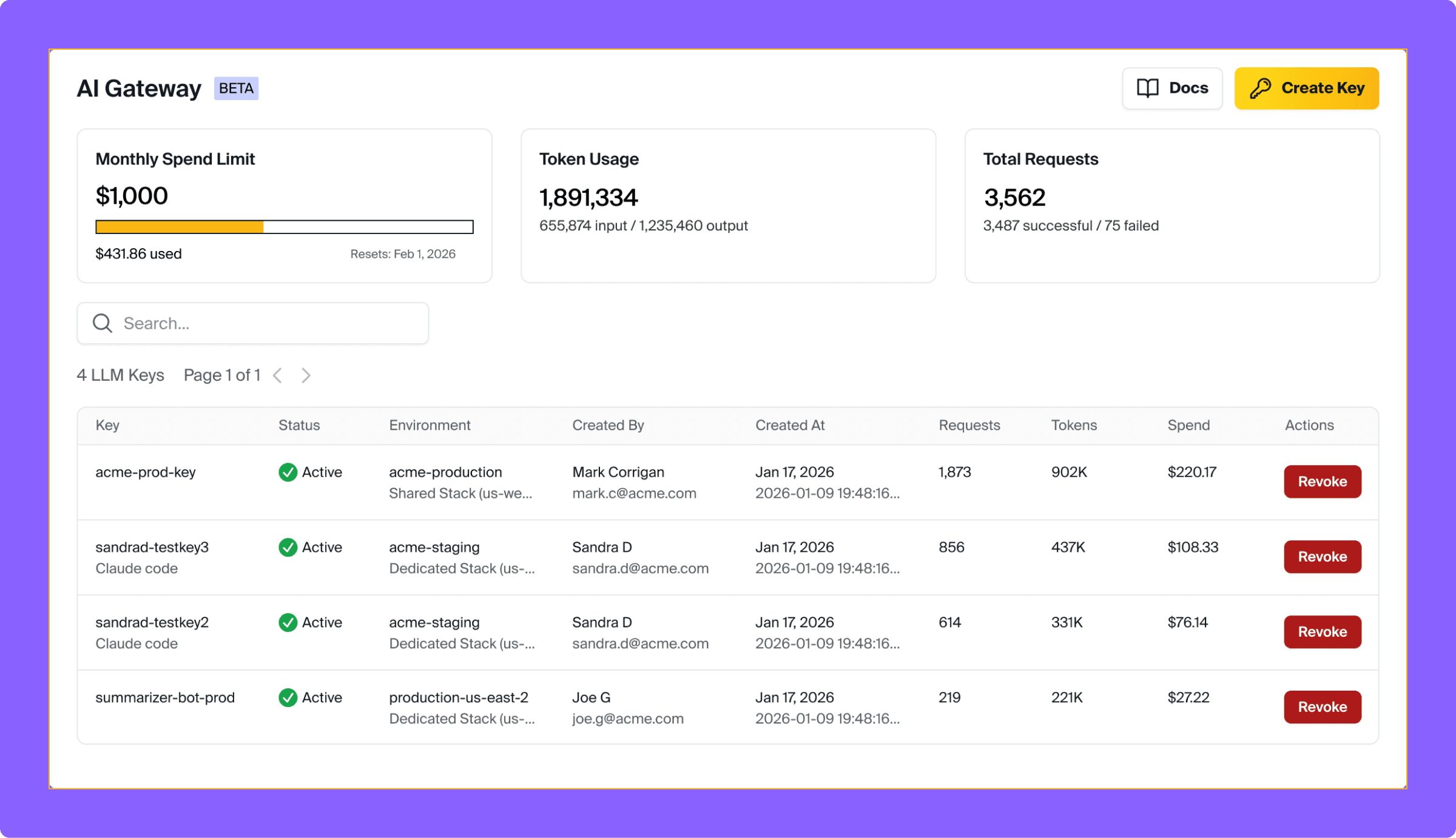 Create scopes for production, development, and internal workflows with different model access rules and budget limits. Teams can explore new models and ideas while keeping production environments stable and governed.
