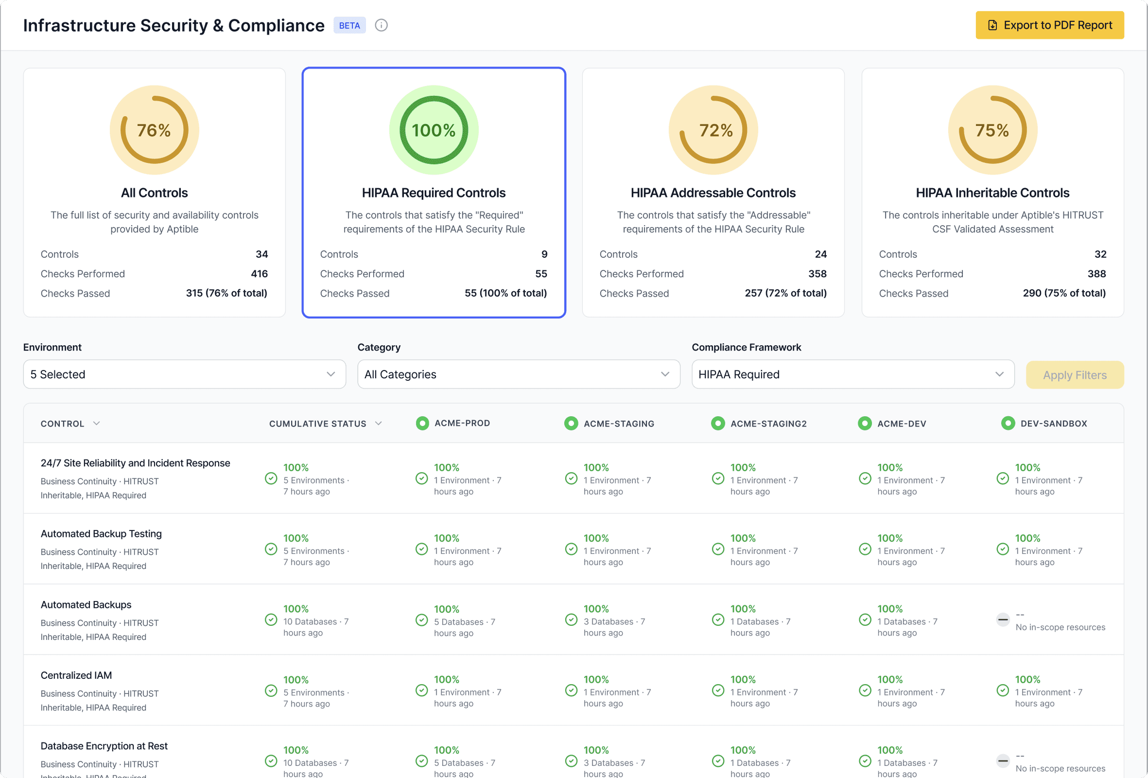 Aptible enforces infrastructure-level controls and produces aligned evidence, so teams don't have to design those safeguards or document how their infrastructure meets HIPAA and HITRUST requirements.
