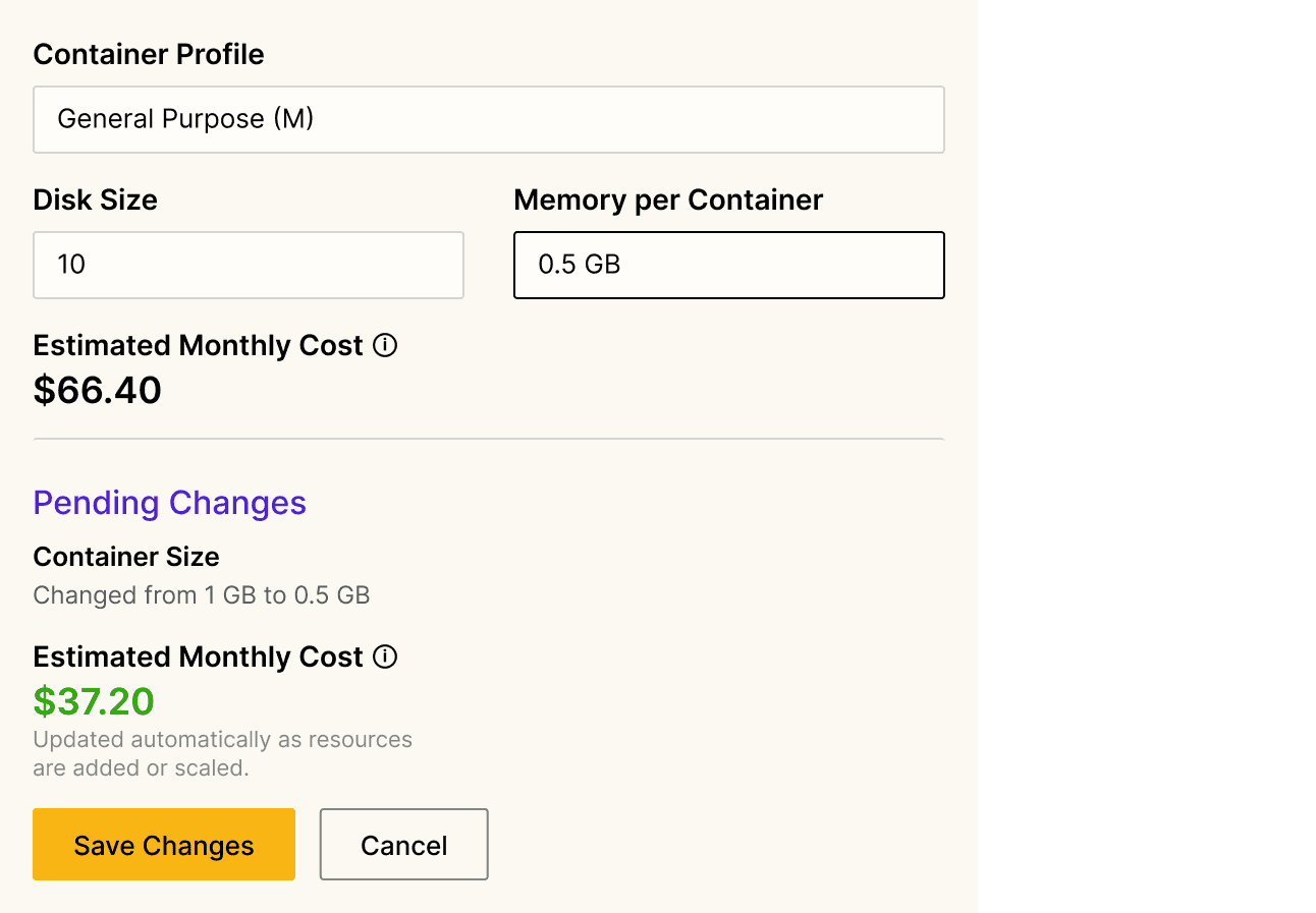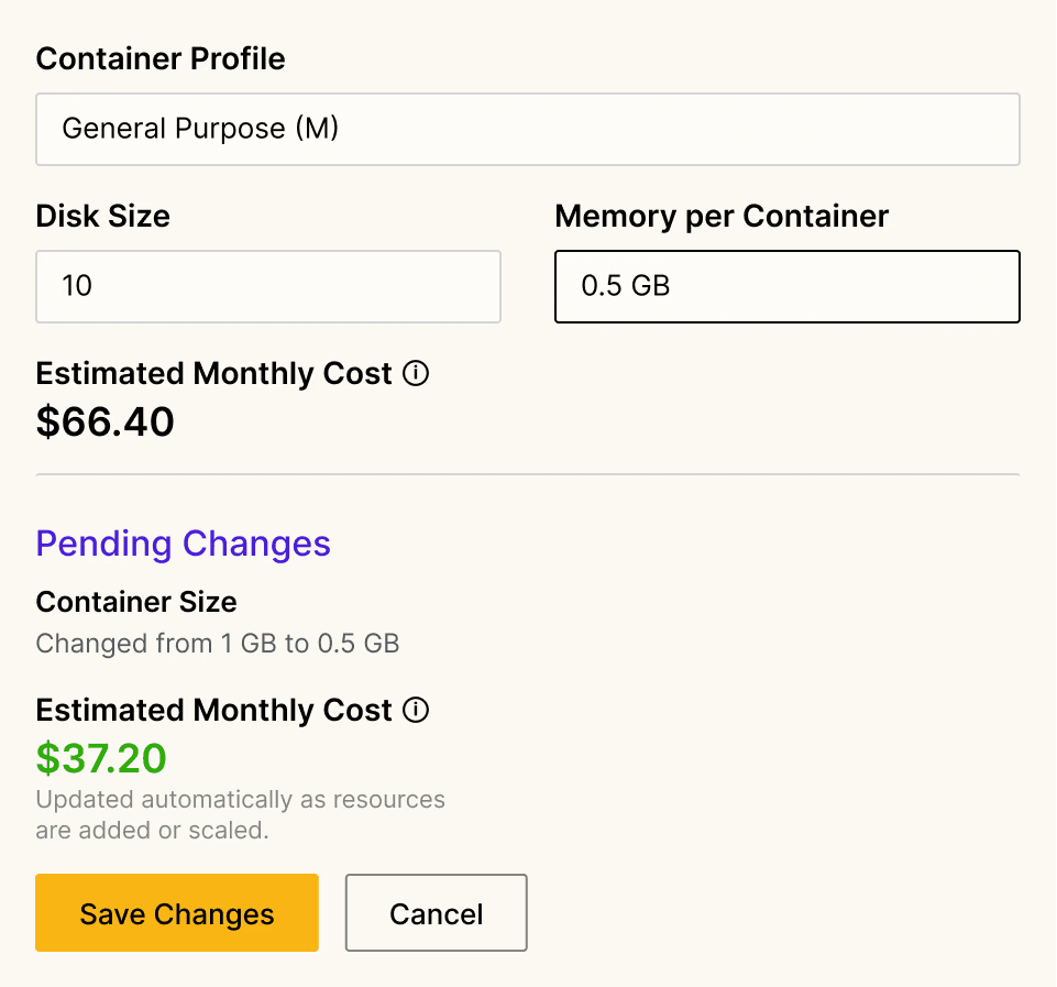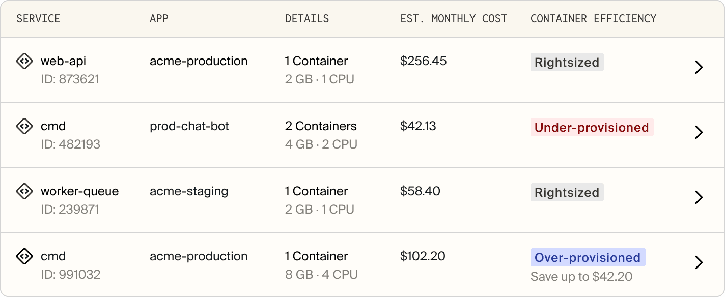 See which app services and databases are over-provisioned, under-provisioned, or rightsized, with recommended container sizes, estimated monthly savings, and a single button to apply the change. Customers switching to CPU- or memory-optimized container profiles have reduced container costs by up to 50%.
