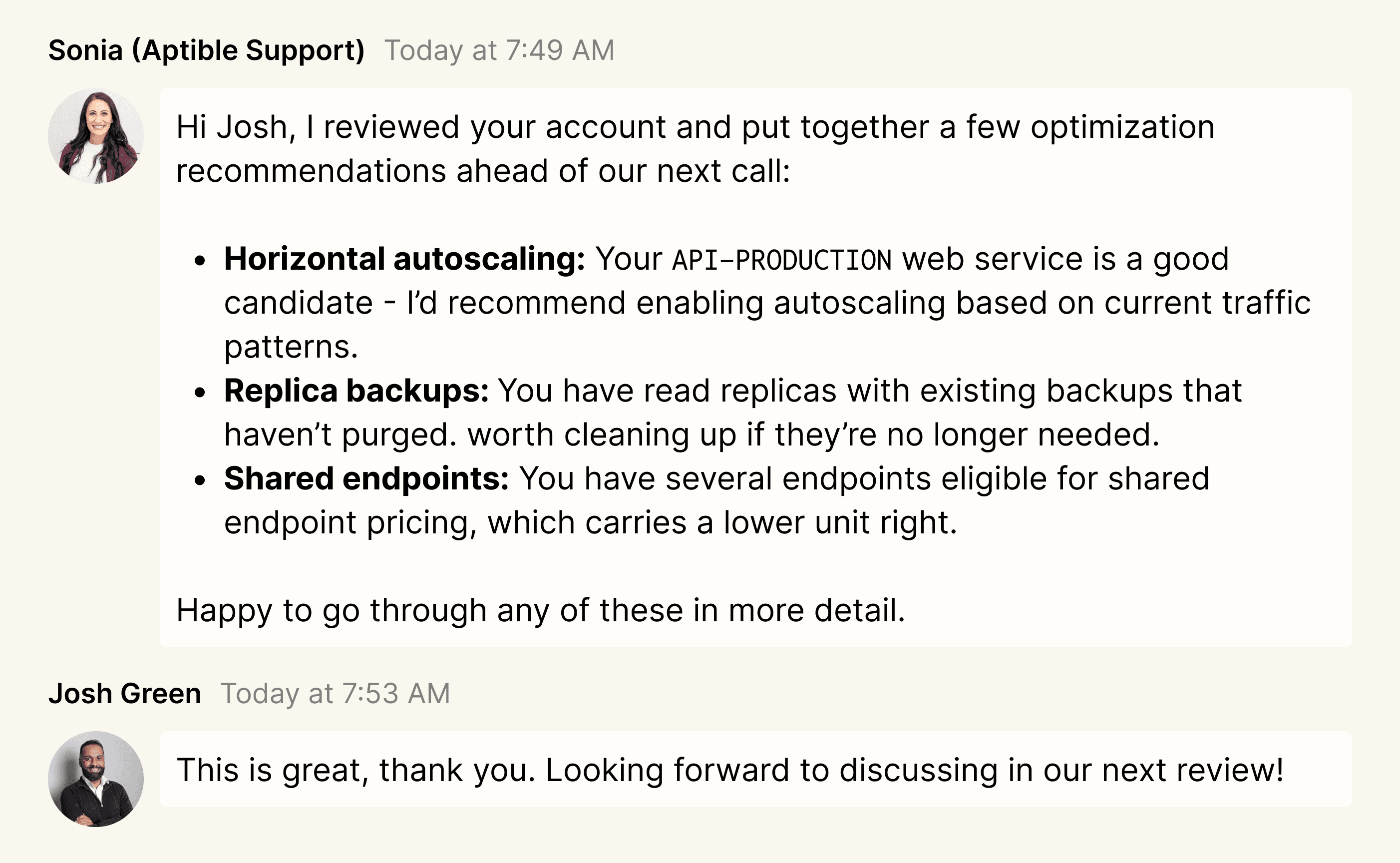Aptible's platform team reviews accounts proactively and surfaces cost-reduction opportunities you may not have found on your own: oversized container profiles, backup accumulation, shared endpoint candidates, and overprovisioned staging resources. Customers have reduced backup spend by up to 50% and cut monthly infrastructure costs by thousands of dollars through optimization reviews alone.